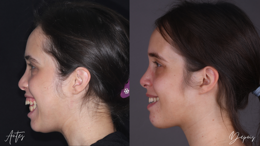 Observem que, a redução da altura facial promoveu um melhor posicionamento dos tecidos moles melhorando a aparência facial. A correção da maxila via miniplaca nos permite também tratar o caso sem nenhum efeito colateral no formato do nariz.